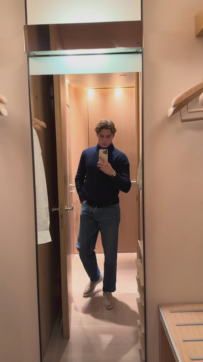 Designed for understated elegance, The Navy Brushed Wool Blouson offers a refined approach to cold-weather dressing. Knitted from a quality resilient wool blend, its structured silhouette is complemented by a luxuriously soft faux fur collar, adding both comfort and distinction. The collar is fully detachable with discreet buttons, allowing for versatile styling throughout the season.